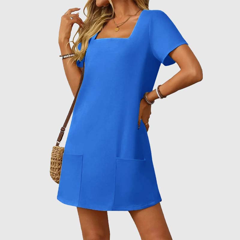 đâłKlĂ€nning med kort Ă€rm och fickor för kvinnor med fyrkantig halsringning och fickor