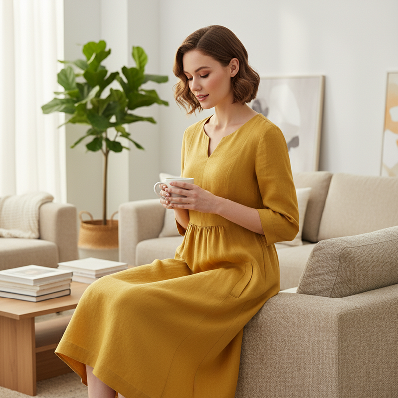 Casual klänning med V-ringning i bomull och linne – 3/4-ärmar, med dragkedja i sidan 👗