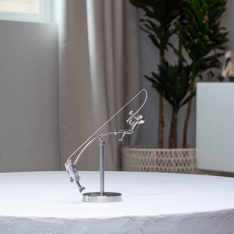 Denna prydnad är tillverkad av utsökt metallhantverk. Figuren och fisken är skickligt balanserade i båda ändarna av fiskespöt. Efter en lätt beröring börjar den svänga graciöst och rytmiskt, som om en fiskare koncentrerar sig på att njuta av ögonblicket när fisken har fastnat på kroken. Dess dynamiska skönhet och balansprincip är inte bara en utmärkt skrivbordsdekoration, utan också ett konstverk fullt av filosofi och glädje. Oavsett om den placeras i arbetsrummet, kontoret, vardagsrummet eller som en unik present, kan den omedelbart förhöja stilen i rummet och ge ditt liv en annan sorts glädje och lugn.