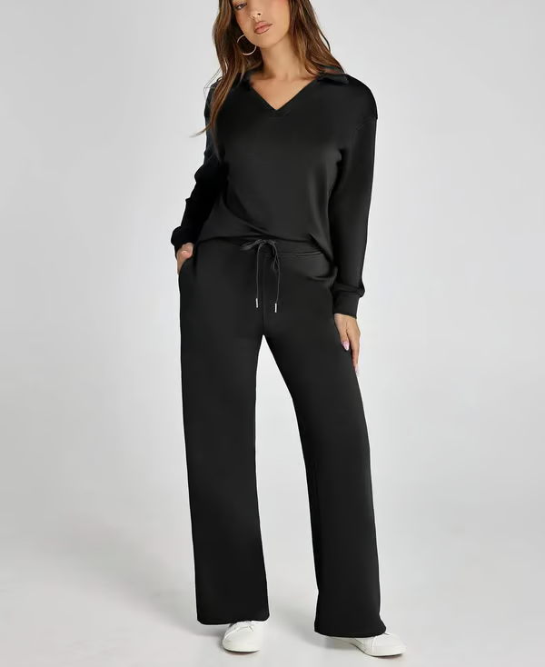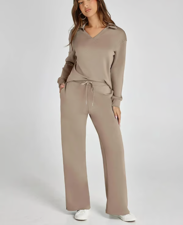 Sweat-setet är designat med en sportig polokrage, V-ringning och hög fåll, byxor med hög midja och dragsko, dragsko för en anpassad passform med en lös passform som avslöjar vida ben, hög fåll ger extra täckning i ryggen, 4-vägs stretch för enkel rörelse.Byxor med hög midja och vida ben är perfekta för att framhäva dina långa ben och visa en lång figur. Överdimensionerad passform för enkla lager på lager och enkel användning hela dagen. Gör dig bekväm hela dagen lång!