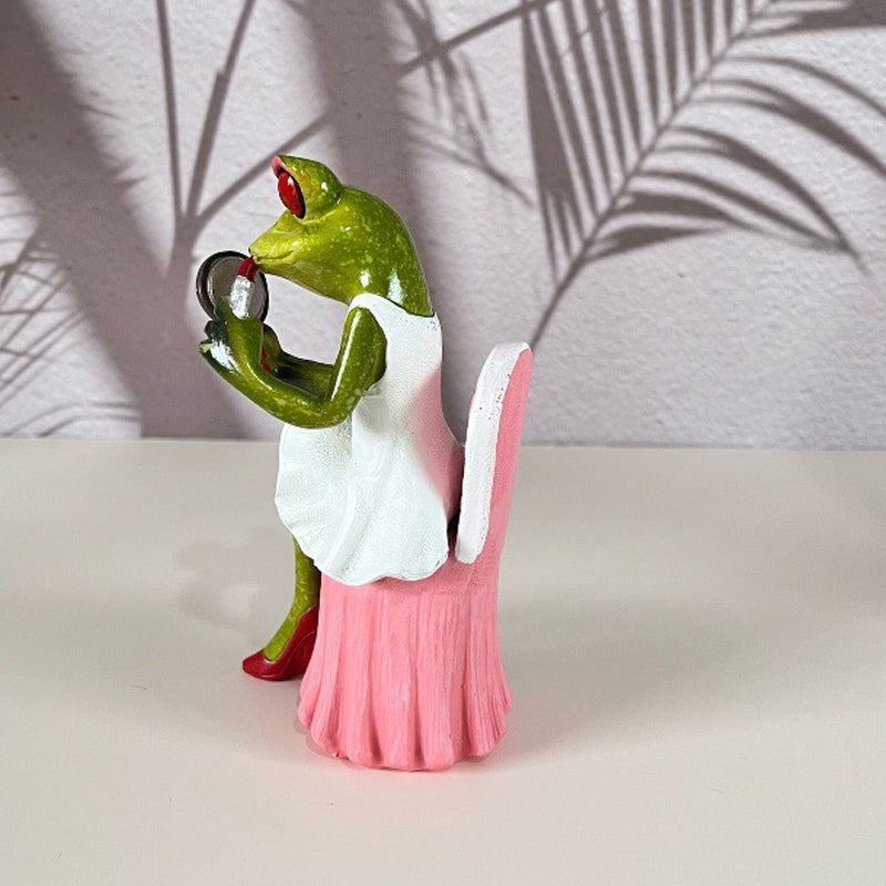 CHARMIG GRODA: Denna distinkta groda har en fantasifull design och föreställer en groda som elegant sitter på en stol och målar läppar. Den är klädd i högklackade skor och klänning och har ett lekfullt men sofistikerat utseende som ger en unik charm till alla rum.