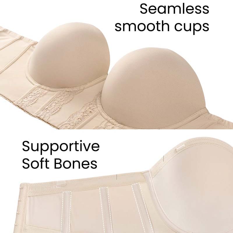 Denna viktiga axelbandslösa bustier-bh ger din silhuett en jämn finish på sidorna och baktill under alla kläder. Säg adjö till utbuktningar på ryggen och bh-linjer. Den har extremt bekväma, breda sido- och ryggband som döljer fett på ryggen och i armhålorna samtidigt som den ger måttlig täckning och maximalt stöd för bysten. De inbyggda sidostöden ger överlägsen, läckagesäker täckning av underarmarna och förhindrar inrullning. Med justerbara och avtagbara breda axelband för stressfri, glidfri komfort.